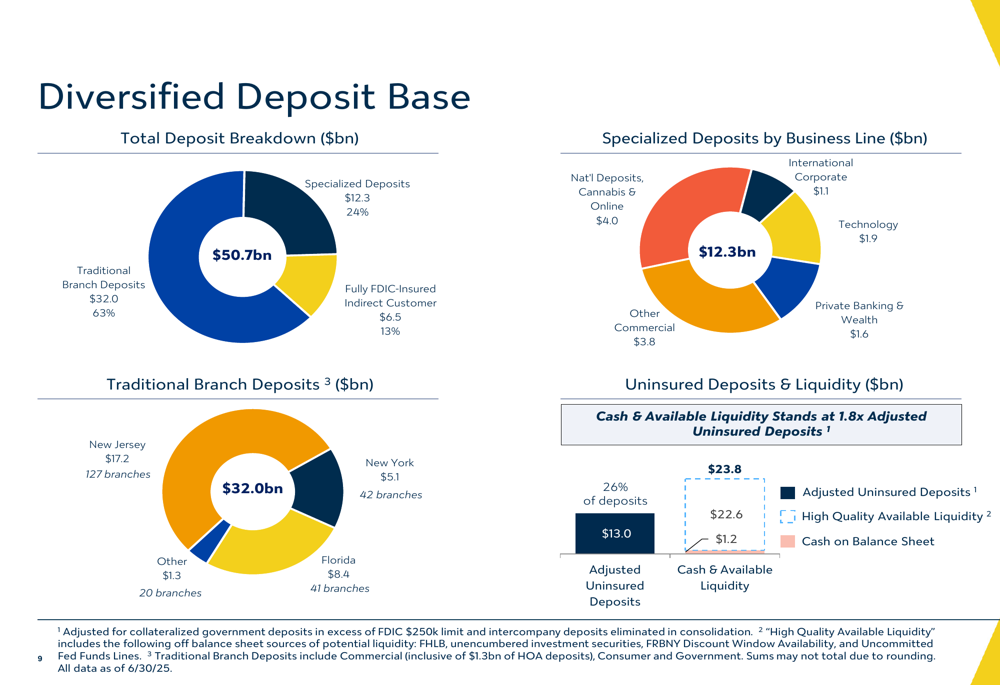 Valley National has been actively diversifying its deposit base, with total deposits reaching $50.7 billion as of June 30, 2025. The bank has significantly reduced its reliance on Northeast branches, which now account for 44% of deposits compared to 78% in 2017, while increasing its presence in the Southeast and through specialty deposit verticals.