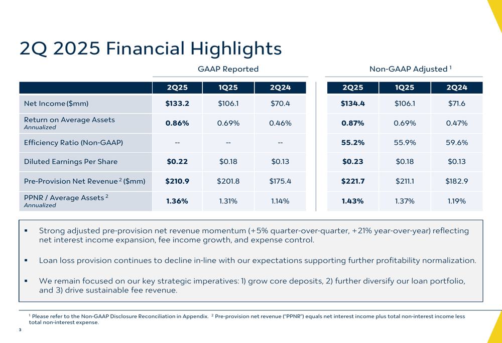 The bank’s net interest margin (NIM) expanded for the fifth consecutive quarter to 3.01%, up from 2.84% in Q2 2024. This improvement in NIM has contributed to stronger net interest income despite a challenging rate environment.