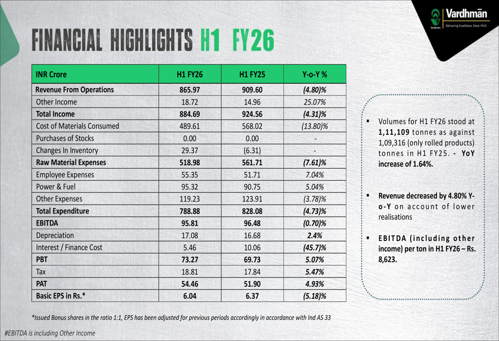 Vardhman Special Steels Limited (VSSL) recently presented its Q2 and H1 FY26 results, showcasing improved profitability metrics despite facing revenue challenges. The company, which specializes in steel bars for automotive applications, continues to leverage its strategic alliance with Aichi Steel Corporation to enhance its market position in the Indian special steels segment.