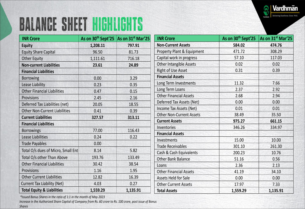 The balance sheet highlights as of September 30, 2025, show a significant increase in equity to Rs. 1,208.11 crores from Rs. 797.91 crores as of March 31, 2025, reflecting the company's strengthened financial position: