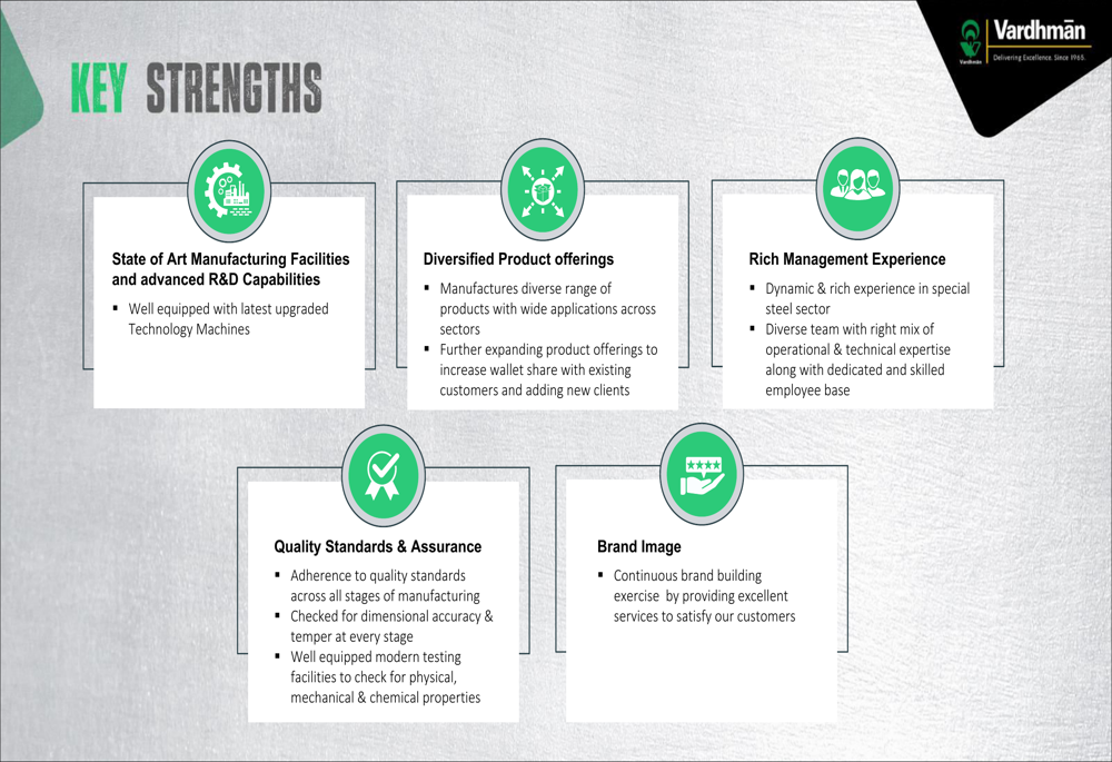 Vardhman's key strengths include state-of-the-art manufacturing facilities, advanced R&D capabilities, diversified product offerings, experienced management, stringent quality standards, and a strong brand image. These competitive advantages position the company well within the special steels market.
