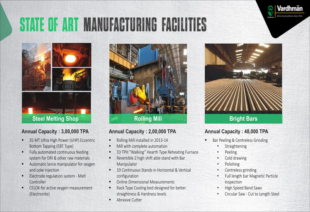 Vardhman Special Steels operates state-of-the-art manufacturing facilities with annual capacities of 300,000 TPA for the Steel Melting Shop, 200,000 TPA for the Rolling Mill, and 48,000 TPA for Bright Bars. The company employs advanced technologies throughout its production process to ensure high-quality outputs.