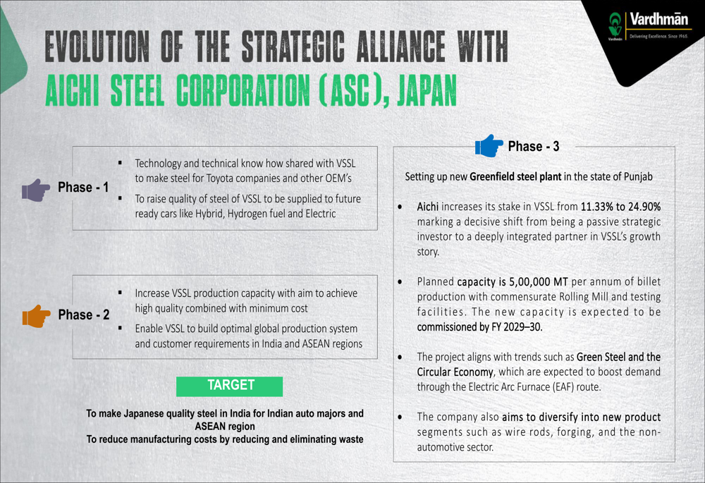 Vardhman Special Steels continues to strengthen its strategic alliance with Aichi Steel Corporation (ASC), which has increased its equity stake to 24.09%. This partnership is evolving through multiple phases, from initial technology sharing to capacity expansion and eventually establishing a new greenfield steel plant in Punjab with a planned capacity of 500,000 MT per annum.