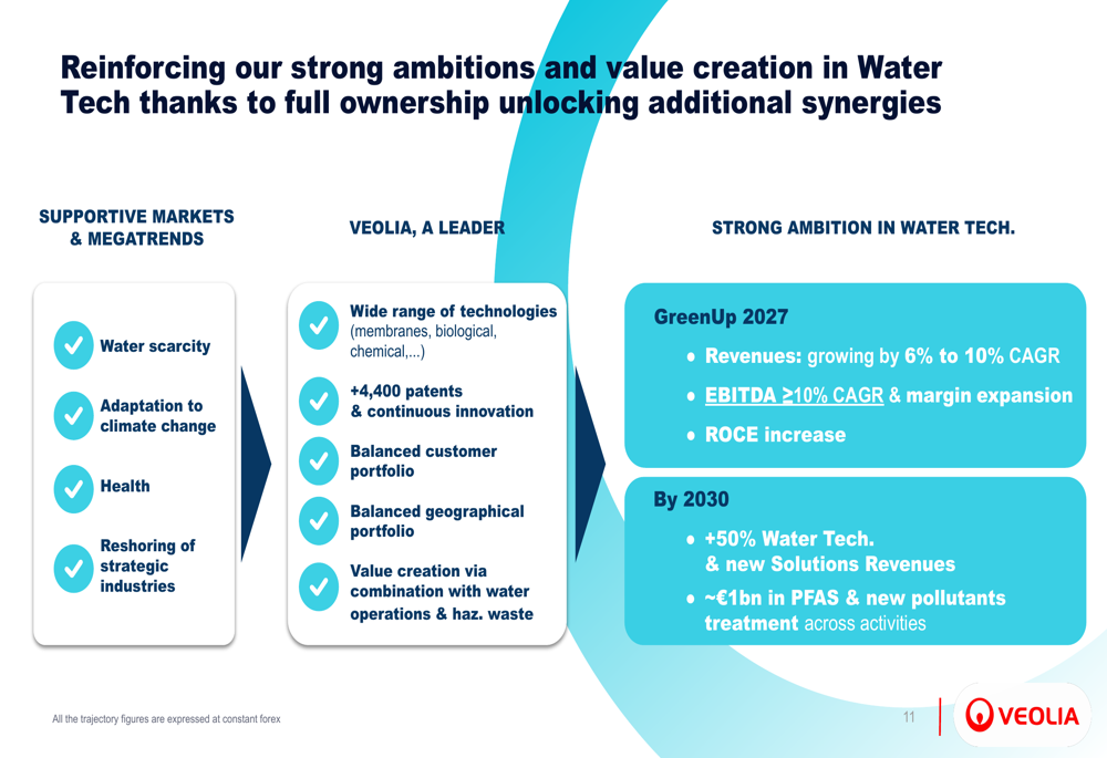 Veolia has particularly ambitious plans for its water technologies business, targeting 6-10% CAGR revenue growth and over 10% EBITDA growth through 2027. The company is positioning itself to address major global challenges including water scarcity, climate adaptation, and the removal of emerging contaminants: