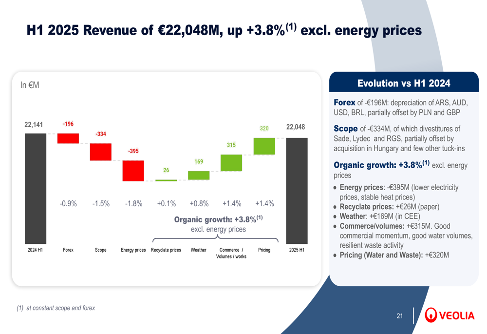Veolia's H1 2025 performance demonstrated balanced growth across its three core business segments. Water operations revenue increased by 3.6%, solid waste grew by 1.5%, and energy services expanded by 5.1% when excluding energy price impacts.