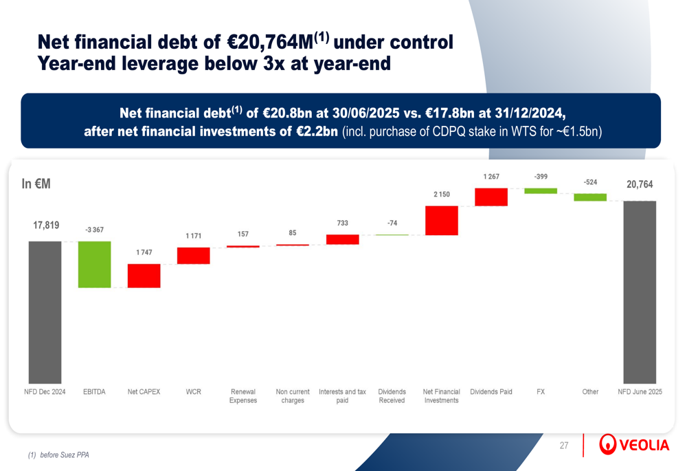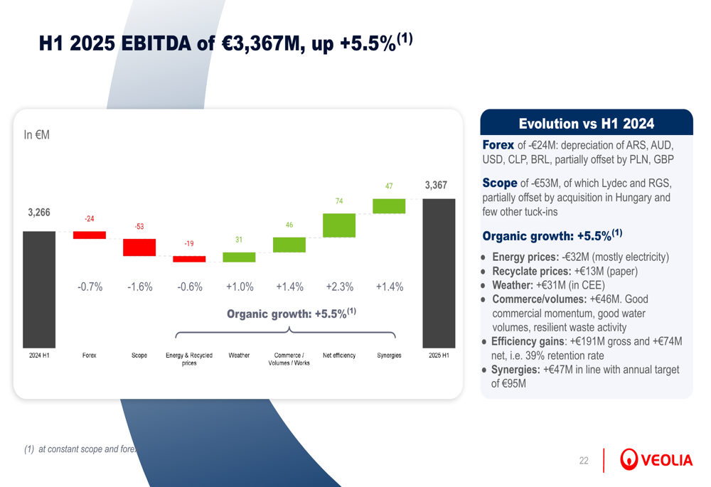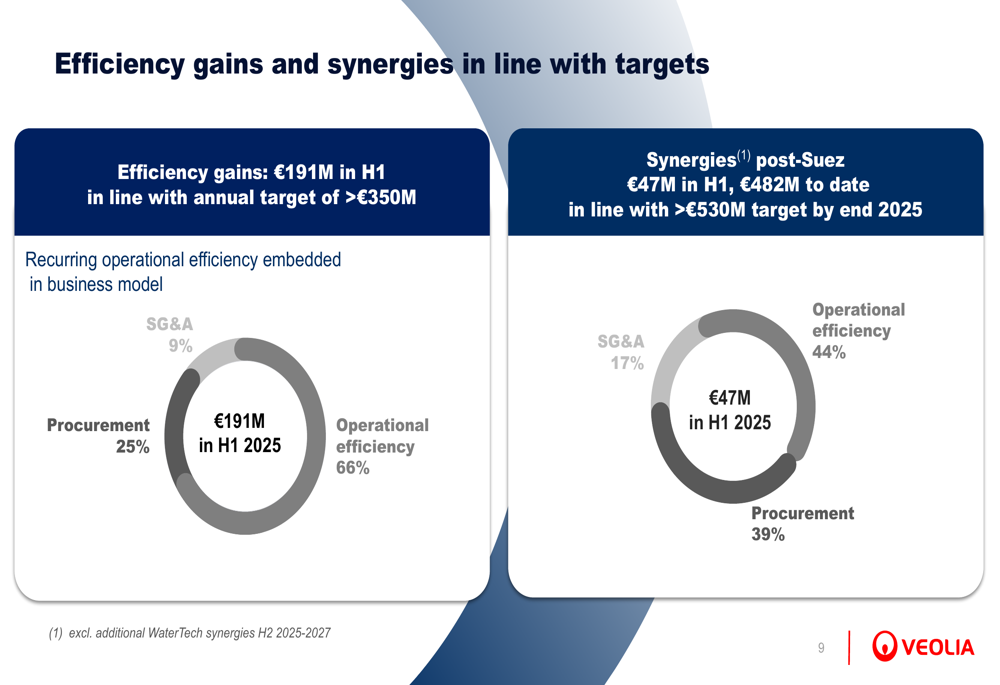 The company's efficiency program remains on track, delivering €191 million in gains during H1 2025, while synergies from the Suez merger reached €47 million for the period and €482 million cumulatively since the acquisition: