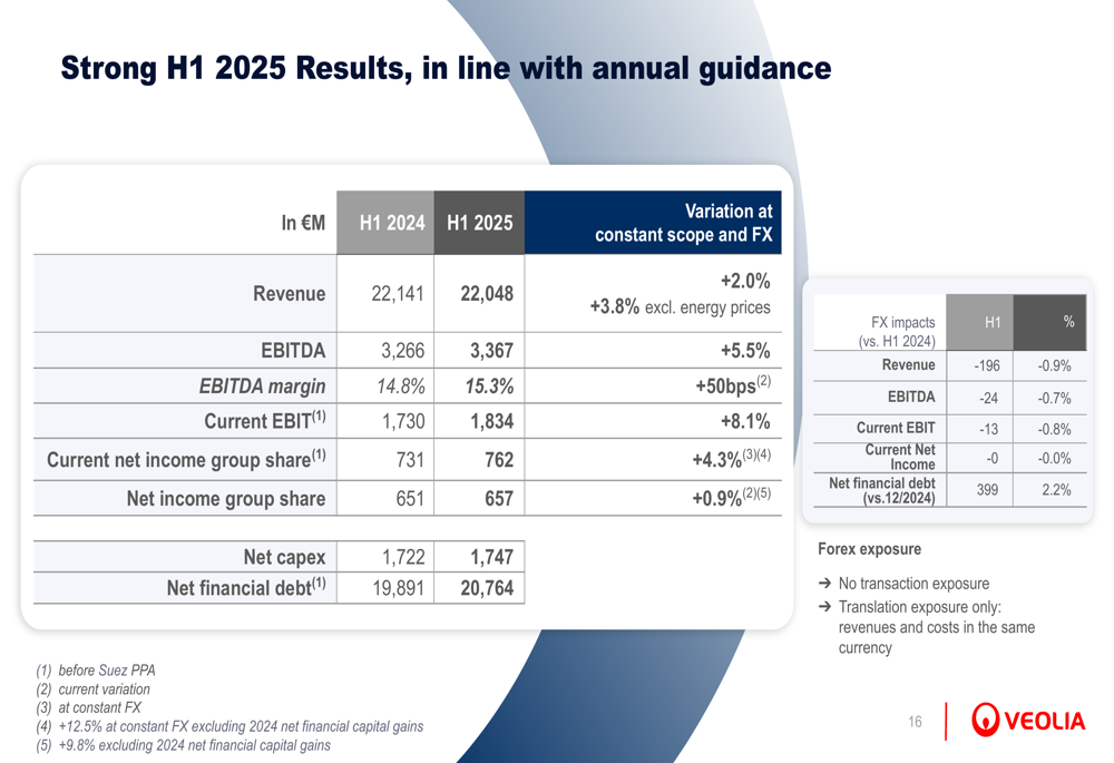 Veolia delivered strong first-half results for 2025, with revenue reaching €22,048 million, up 3.8% excluding energy prices, and EBITDA growing 5.5% to €3,367 million. The company highlighted its "winning formula" of resilience and growth, supported by a diversified geographic footprint and business portfolio.
