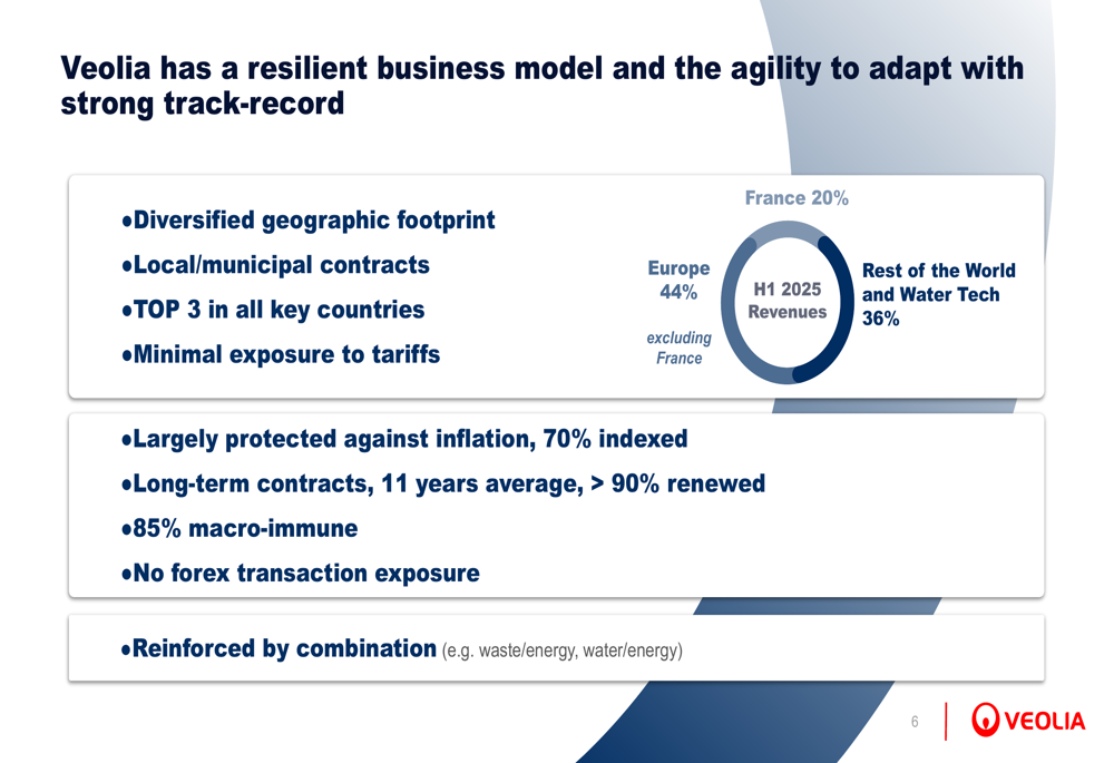 Veolia's strategic focus centers on its GreenUp Plan, which balances resilient "Strongholds" activities with high-growth "Boosters." The company's resilient business model is built on geographic diversification, long-term contracts, and strong inflation protection: