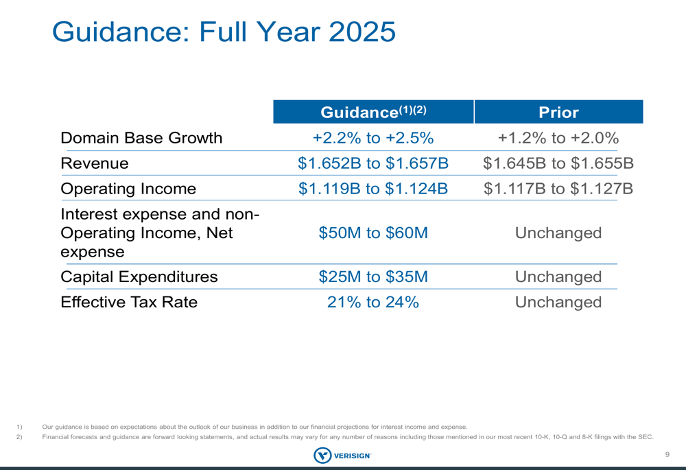 Based on the strong performance in Q3, VeriSign raised its full-year 2025 guidance. The company now expects domain base growth of 2.2% to 2.5%, up from the previous guidance of 1.2% to 2.0%. Revenue guidance was increased to $1.652 billion to $1.657 billion, compared to the previous range of $1.645 billion to $1.655 billion.