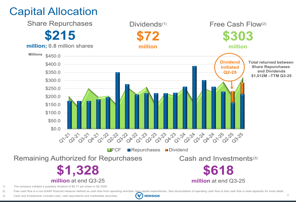 VeriSign continued its shareholder return program through both share repurchases and dividends. During Q3 2025, the company repurchased 0.8 million shares for $215 million and paid $72 million in dividends. In total, VeriSign returned $1,012 million to shareholders over the trailing twelve months.