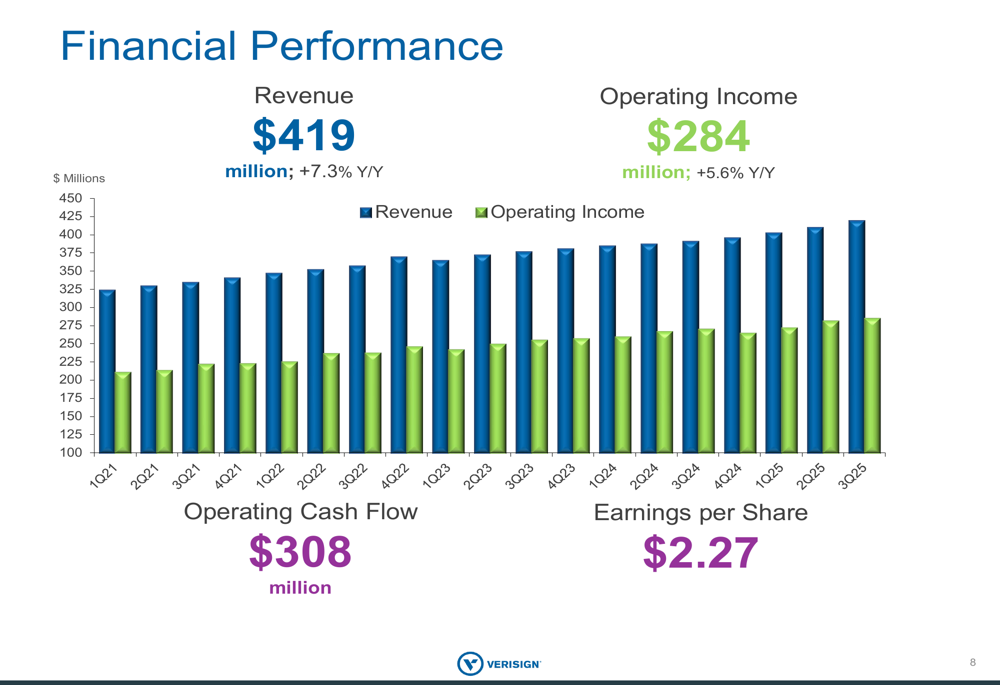 VeriSign’s financial performance remained strong across key metrics. The company’s revenue growth of 7.3% year-over-year to $419 million and operating income increase of 5.6% to $284 million demonstrate continued momentum in its core business.