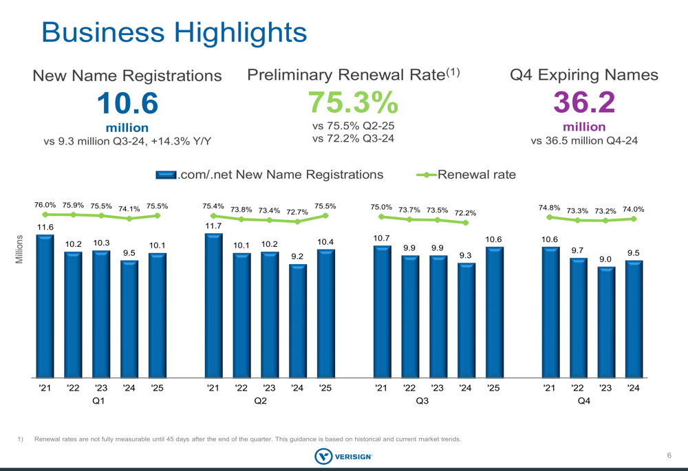 New name registrations showed significant strength, reaching 10.6 million during the quarter, a substantial 14.3% increase from the 9.3 million registered in Q3 2024. The preliminary renewal rate was 75.3%, slightly down from 75.5% in Q2 2025 but notably improved from 72.2% in Q3 2024. The company also noted that Q4 expiring names total 36.2 million, compared to 36.5 million in Q4 2024.