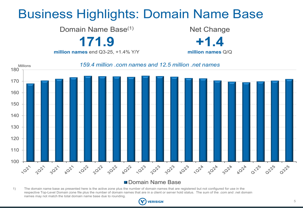 VeriSign’s domain name base grew to 171.9 million names by the end of Q3 2025, representing a 1.4% year-over-year increase. The net change was positive 1.4 million names quarter-over-quarter. The domain base consists of 159.4 million .com names and 12.5 million .net names.