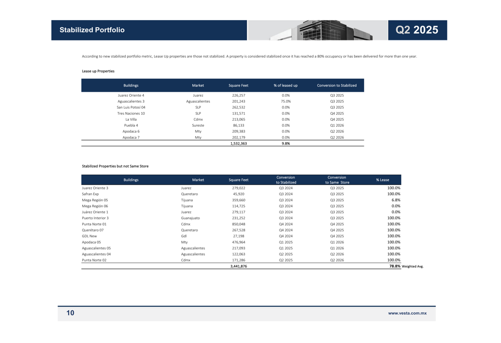 Looking ahead, Vesta is focused on its Route 2030 strategy, with plans to renew approximately 4 million square feet of leases in 2026. The company anticipates potential rent increases of 20-30% on these renewals, supported by the positive leasing spread trend that increased to 13.7% in Q2 2025 from 7.7% in Q3 2024.