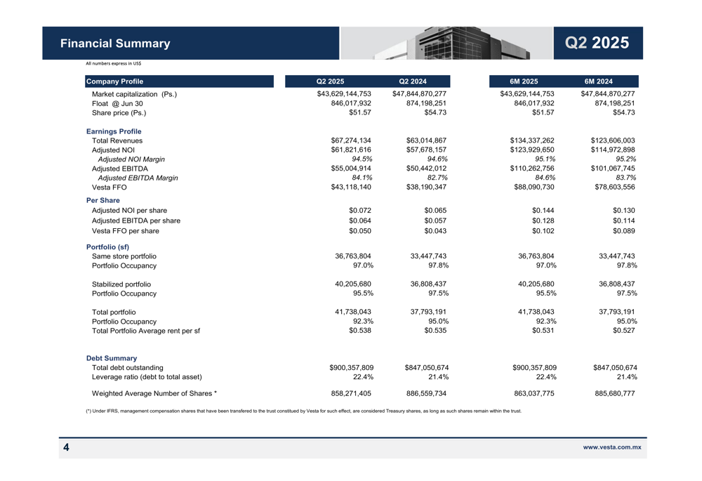 Vesta reported a 6.8% year-over-year increase in total revenues to $67.27 million in Q2 2025, up from $63.01 million in Q2 2024. Adjusted NOI grew 7.2% to $61.82 million, while Adjusted EBITDA rose 9.0% to $55.00 million. Despite these positive operational metrics, profit for the period decreased significantly by 74.6% to $27.72 million, compared to $109.30 million in the same period last year.