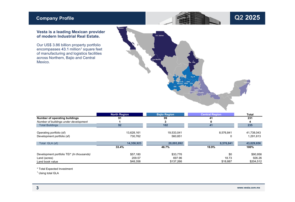 Corporacion Inmobiliaria Vesta (VESTA), a leading Mexican provider of industrial real estate, released its Q2 2025 supplementary presentation on July 25, showcasing a portfolio valued at US$3.86 billion. The company maintains a strategic presence across Northern, Bajio, and Central Mexico with 43.1 million square feet of manufacturing and logistics facilities, positioning itself to capitalize on nearshoring trends despite current market caution.