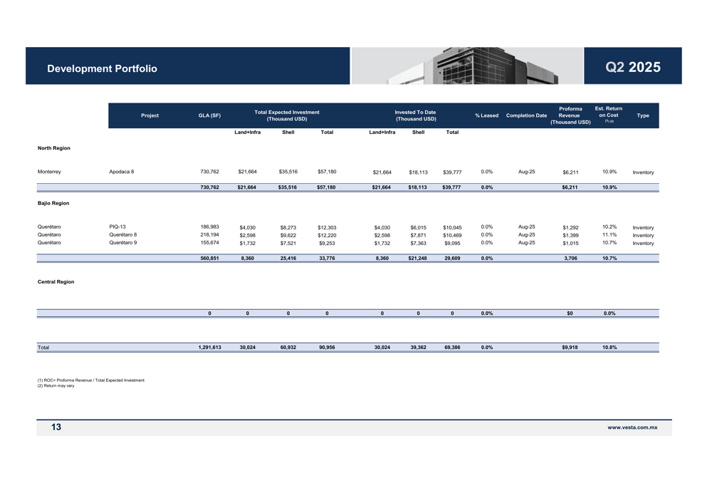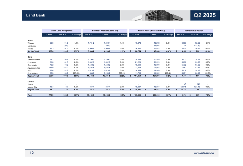 Vesta continues to invest in future growth through its development pipeline and strategic land acquisitions. The company’s land bank increased in value by 28.1% from Q1 2025 to Q2 2025, reaching $204.51 million. Notable projects under development include Apodaca 8 in Monterrey with 730,762 sqft and a total expected investment of $57.18 million, and PIQ-13 in Queretaro with 186,983 sqft and a $12.30 million investment.
