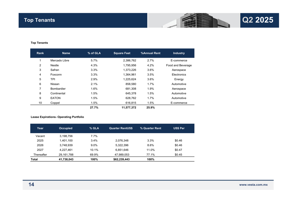 Vesta’s tenant diversification remains strong, with Mercado Libre representing the largest tenant at 5.7% of gross leasable area (GLA), followed by Nestle at 4.3% and Safran at 3.3%. Importantly, 69.9% of leases expire after 2027, providing revenue stability for the coming years.