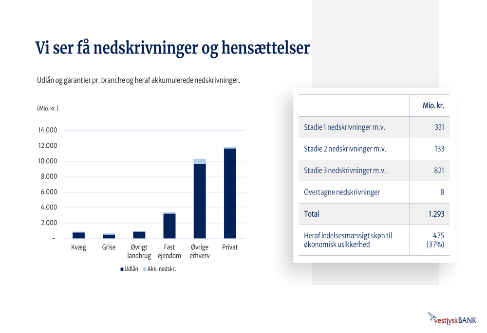 Impairments and provisions remained at low levels, with total accumulated write-downs of 1,293 million DKK. Of this amount, 37% (475 million DKK) represents management’s estimate for economic uncertainty.