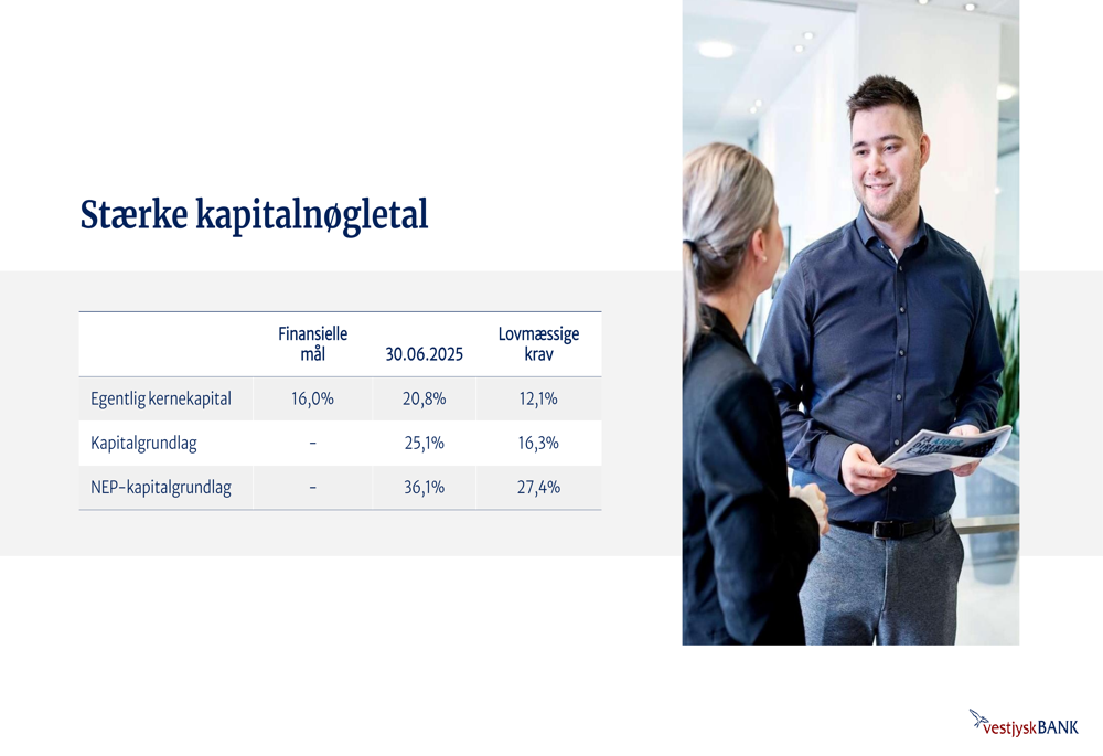 Vestjysk Bank continues to maintain strong capital ratios, with Core Tier 1 capital at 20.8%, significantly exceeding both its financial target of 16.0% and the regulatory requirement of 12.1%. The bank’s total capital ratio stands at 25.1%, while its NEP capital ratio (for resolution purposes) is 36.1%.