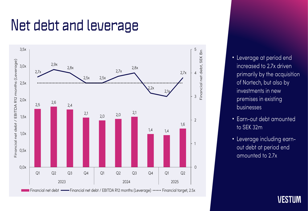 Vestum’s financial position saw some changes during the quarter, with leverage increasing to 2.65x, primarily driven by the acquisition of Nortech and investments in new facilities for existing businesses.