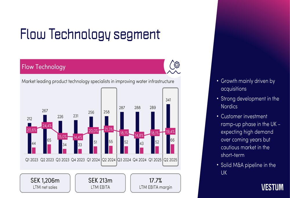 The Flow Technology segment demonstrated robust growth with Q2 2025 sales reaching 341 SEKm and an impressive adjusted EBITA margin of 19.4%. This segment has shown consistent strength, particularly in Nordic markets, while positioning for future growth in the UK: