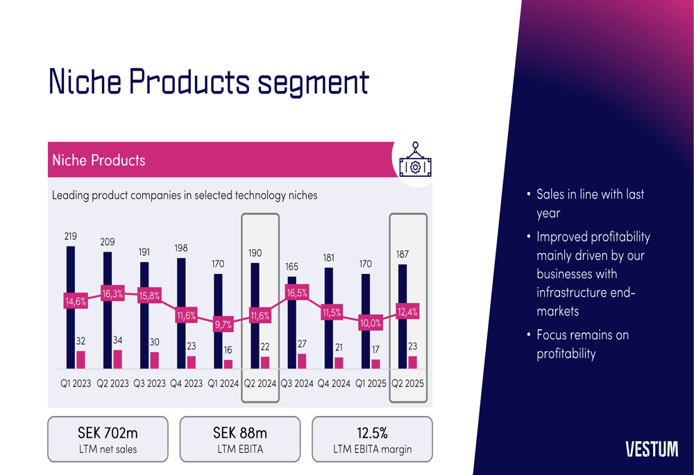 The Niche Products segment maintained stable performance with Q2 2025 sales of 187 SEKm, matching the previous year, while improving its adjusted EBITA margin to 12.4%. This improvement was primarily driven by businesses serving infrastructure end-markets: