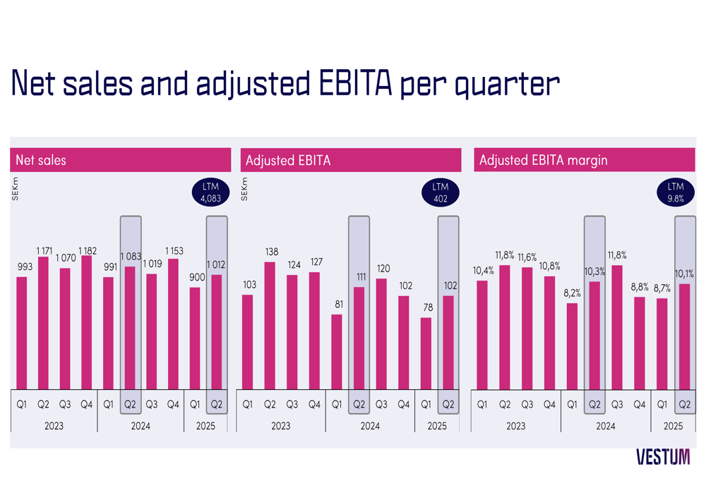 As shown in the following quarterly performance overview, Vestum maintained stable profitability with an adjusted EBITA of 102 SEKm and a margin of 10.1%: