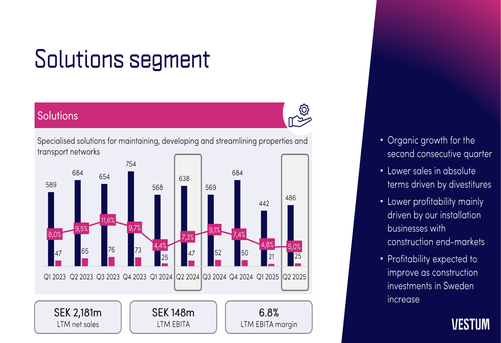 In contrast, the Solutions segment continued to face challenges, particularly in installation businesses with construction end-markets. Q2 2025 sales were 486 SEKm with an adjusted EBITA margin of just 5.0%, though the segment did achieve organic growth for the second consecutive quarter: