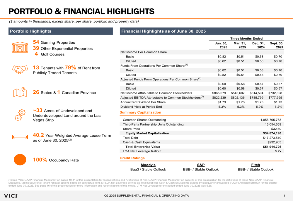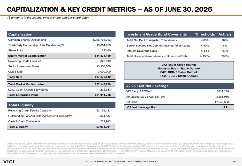 VICI maintains a solid financial position with investment grade credit ratings from all three major rating agencies (Moody’s, S&P, and Fitch). As of June 30, 2025, the company reported total debt of $17.3 billion and a total enterprise value of $51.9 billion.