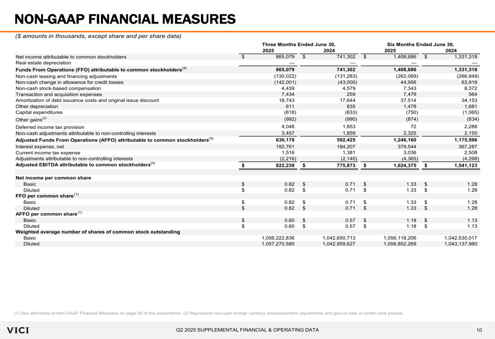 Based on strong first-half performance, VICI raised its full-year 2025 AFFO guidance. The company now expects AFFO to be between $2,500 million and $2,520 million, or between $2.35 and $2.37 per diluted common share, up from the previous guidance of $2,470-$2,500 million ($2.33-$2.36 per share).