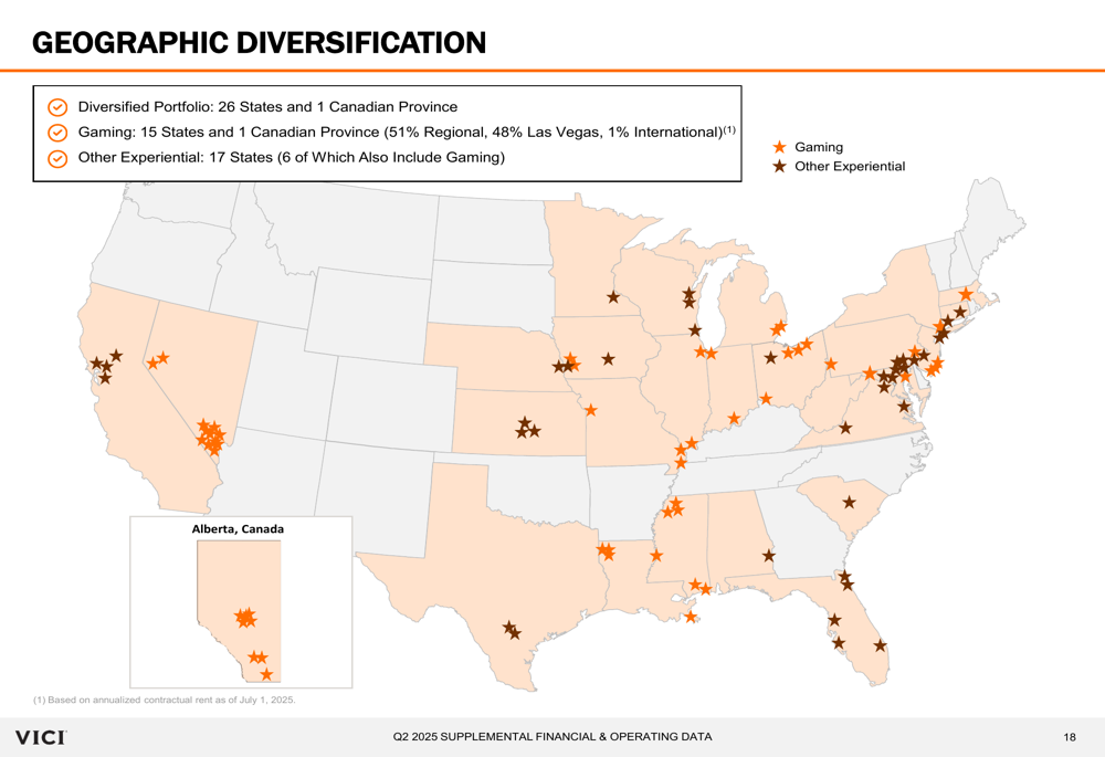 Geographic diversification is another key strength of VICI’s portfolio, with properties spread across 26 states and one Canadian province. This widespread presence helps mitigate regional economic risks and provides exposure to various markets: