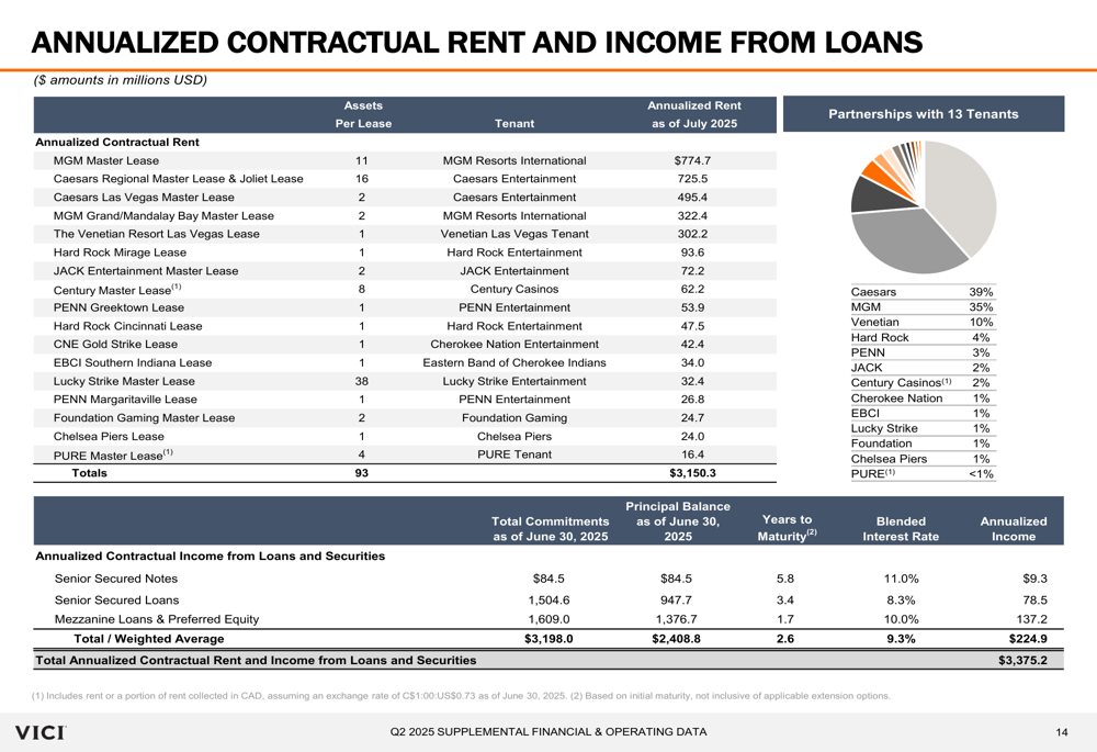 The following chart illustrates VICI’s tenant diversification, with Caesars (39%) and MGM (35%) representing the largest contributors to the company’s $3.15 billion in annualized contractual rent: