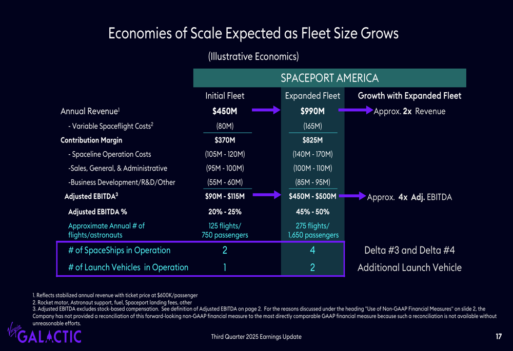 More impressively, an expanded fleet with four spaceships and two launch vehicles could potentially generate $990 million in annual revenue from 275 flights carrying 1,650 passengers, with Adjusted EBITDA reaching $450-500 million.
