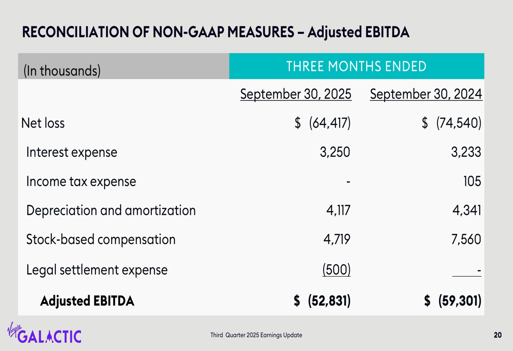 Virgin Galactic's financial statements reveal the significant ongoing investment required to develop its spacecraft fleet. The reconciliation of non-GAAP measures shows the components of the company's Adjusted EBITDA calculation:
