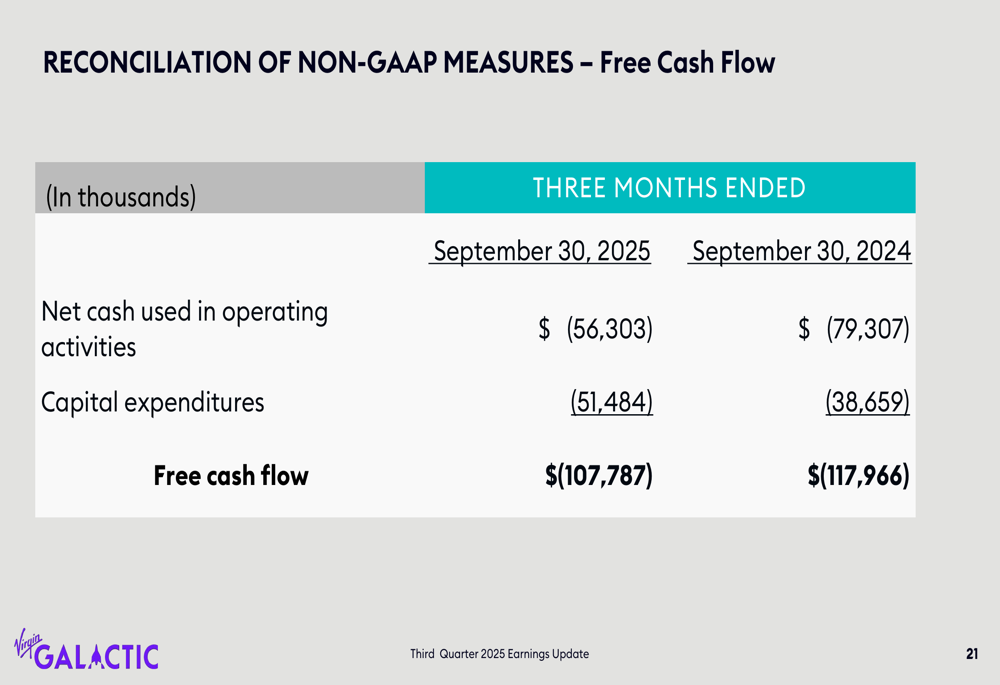 Similarly, the free cash flow reconciliation demonstrates the substantial cash burn rate as the company continues to invest in capital expenditures: