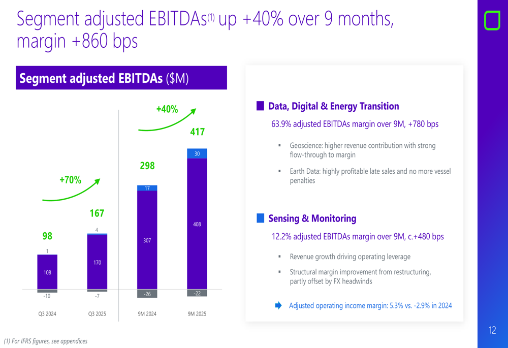 Viridien’s overall segment revenue growth of 14% over the first nine months of 2025 was accompanied by a significant improvement in profitability, with segment adjusted EBITDAs margin expanding by 860 basis points.