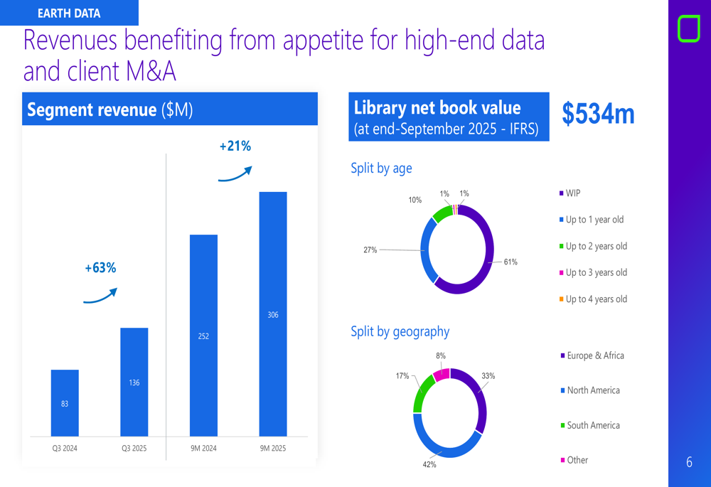 The Earth Data segment demonstrated exceptional performance with Q3 revenue of $136 million, a remarkable 63% increase year-over-year. Nine-month revenue reached $306 million, up 21% from the same period in 2024. The segment’s library net book value stood at $534 million as of September 2025.