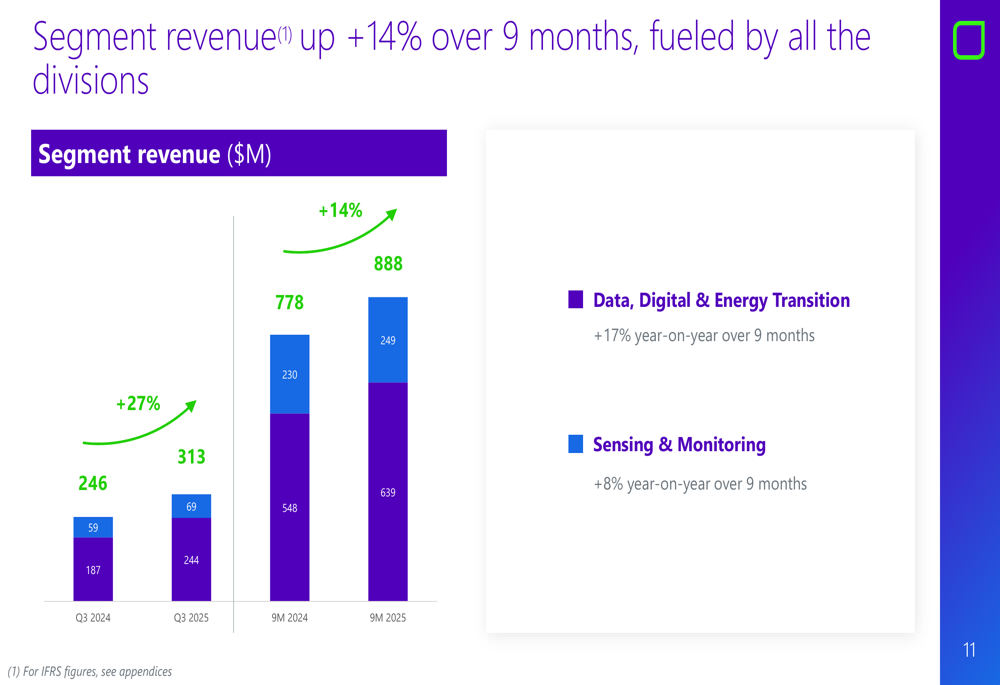 The Sensing & Monitoring segment also showed positive momentum with Q3 revenue of $69 million (+16% YoY) and nine-month revenue of $249 million (+8% YoY). Land activities were particularly strong, with nine-month revenue up 36% to $139 million, while marine activities declined 24% to $67 million.