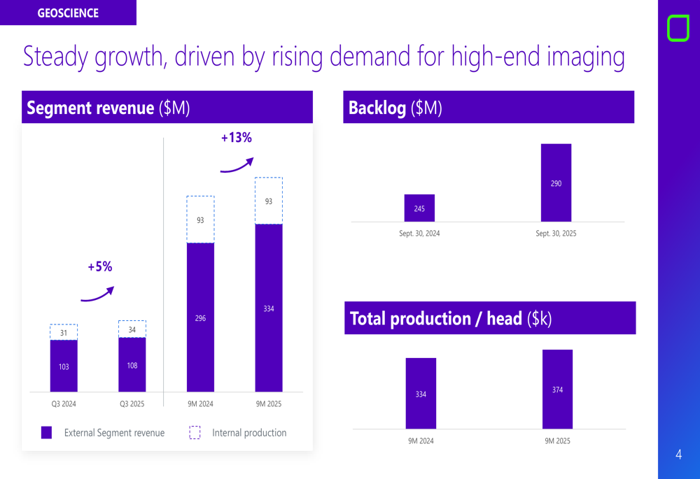 The Geoscience division reported steady growth with Q3 revenue of $108 million (+5% YoY) and nine-month revenue of $334 million (+13% YoY). The division’s backlog stood at $290 million, up 19% from the previous year, indicating strong future revenue potential. The following chart illustrates this growth: