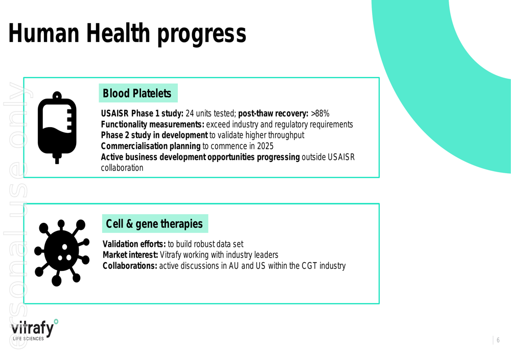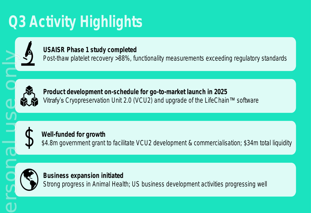 Vitrafy reported several significant achievements during the third quarter, including the completion of a Phase 1 study with the US Army Institute of Surgical Research (USAISR) that demonstrated post-thaw platelet recovery exceeding 88%, with functionality measurements surpassing regulatory standards.