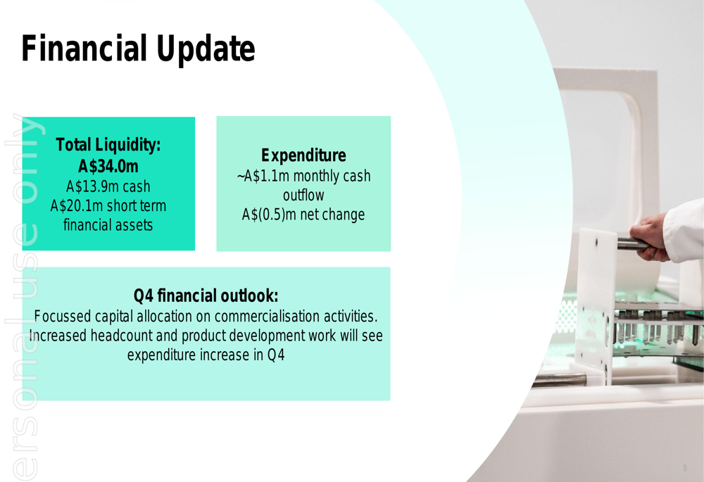 Vitrafy maintains a strong financial foundation with total liquidity of A$34.0 million, comprising A$13.9 million in cash and A$20.1 million in short-term financial assets. The company reported a monthly cash outflow of approximately A$1.1 million, with a net change of A$(0.5) million for the quarter.