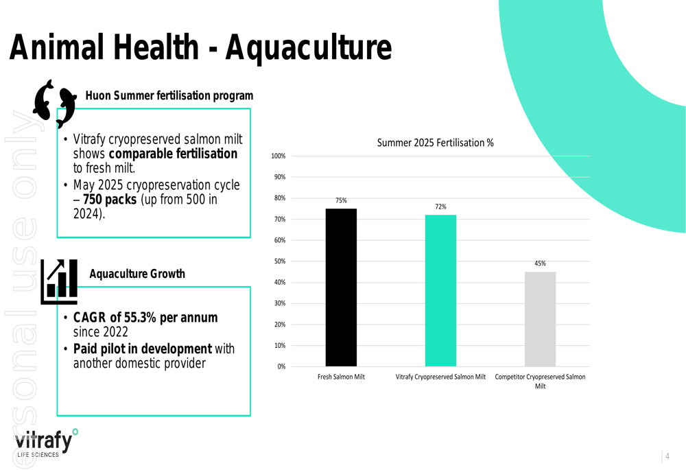 In the animal health segment, Vitrafy’s cryopreservation technology continues to demonstrate strong competitive advantages. The company’s salmon milt preservation process achieved a 72% fertilization rate, comparable to fresh milt (75%) and significantly outperforming competitor solutions (45%). This performance has helped drive a 55.3% compound annual growth rate in the aquaculture business since 2022.