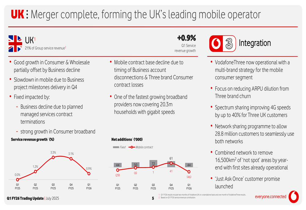 In the UK, Vodafone completed its merger with Three, consolidating financial results from June 1, 2025. The UK market, representing 21% of group service revenue, delivered 0.9% growth in Q1, with good performance in Consumer and Wholesale segments partially offset by Business decline.