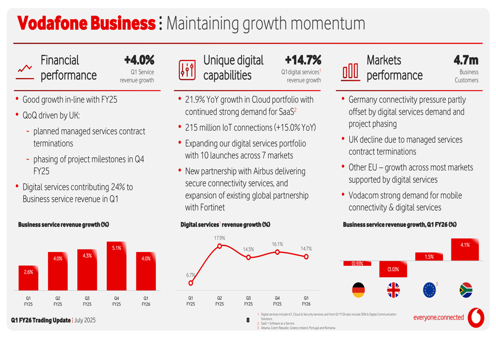 Vodafone Business, a key strategic focus area, delivered 4.0% service revenue growth in Q1 FY26. Digital services now contribute 24% to Business service revenue, growing at 14.7% year-over-year. The company’s IoT connections reached 215 million, representing 15.0% growth compared to the previous year.
