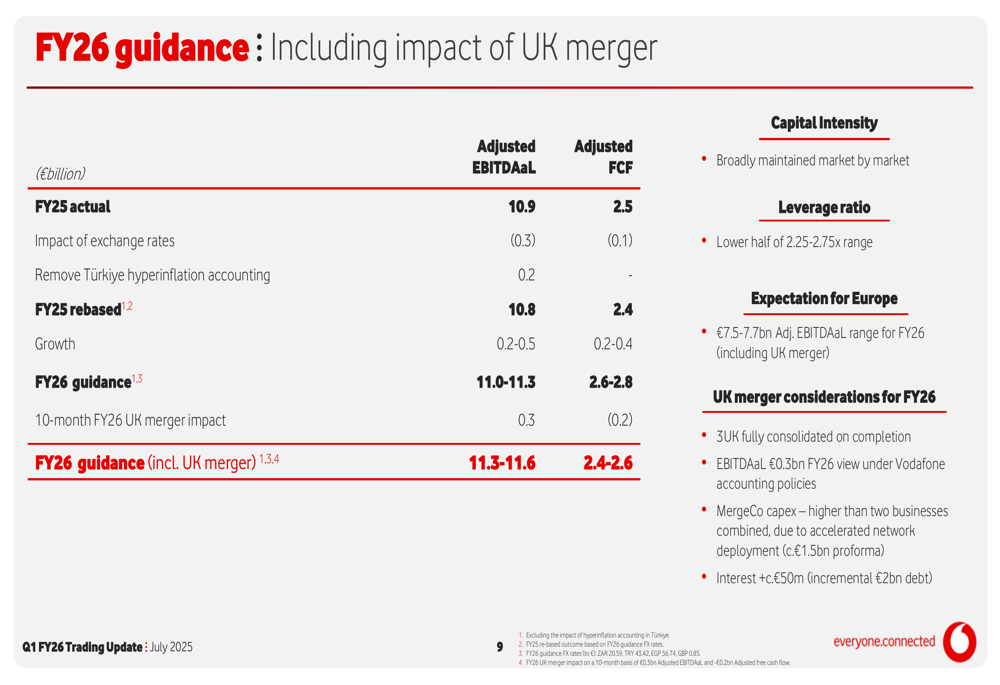 For Europe specifically, Vodafone projects adjusted EBITDAAL in the range of €7.5-7.7 billion for FY26, including the impact of the UK merger. The merger is expected to contribute €0.3 billion to EBITDAAL in FY26, though capital expenditure will be higher than the two businesses combined due to accelerated network deployment.