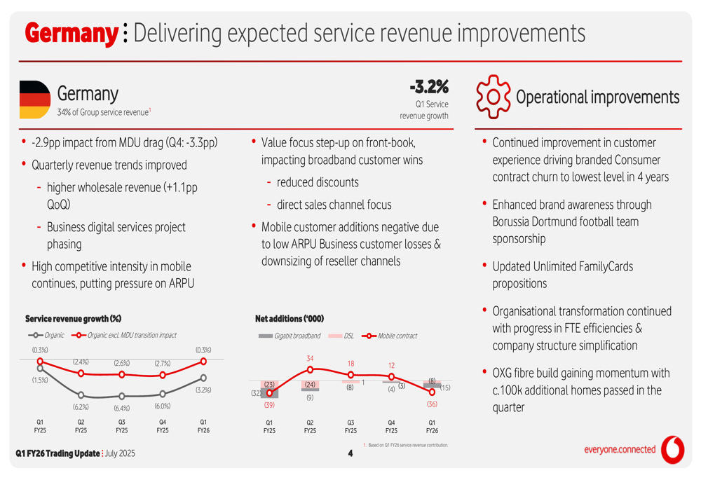 - Germany service revenue: -3.2% (-0.3% excluding MDU impact)