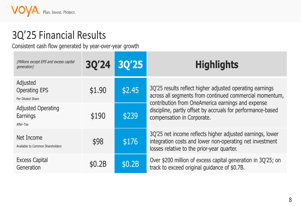 Voya reported adjusted operating earnings per share of $2.45 for Q3 2025, a 29% increase from $1.90 in the same period last year, exceeding analyst expectations of $2.23. Adjusted operating earnings rose to $239 million from $190 million in Q3 2024, while net income jumped 80% to $176 million from $98 million.