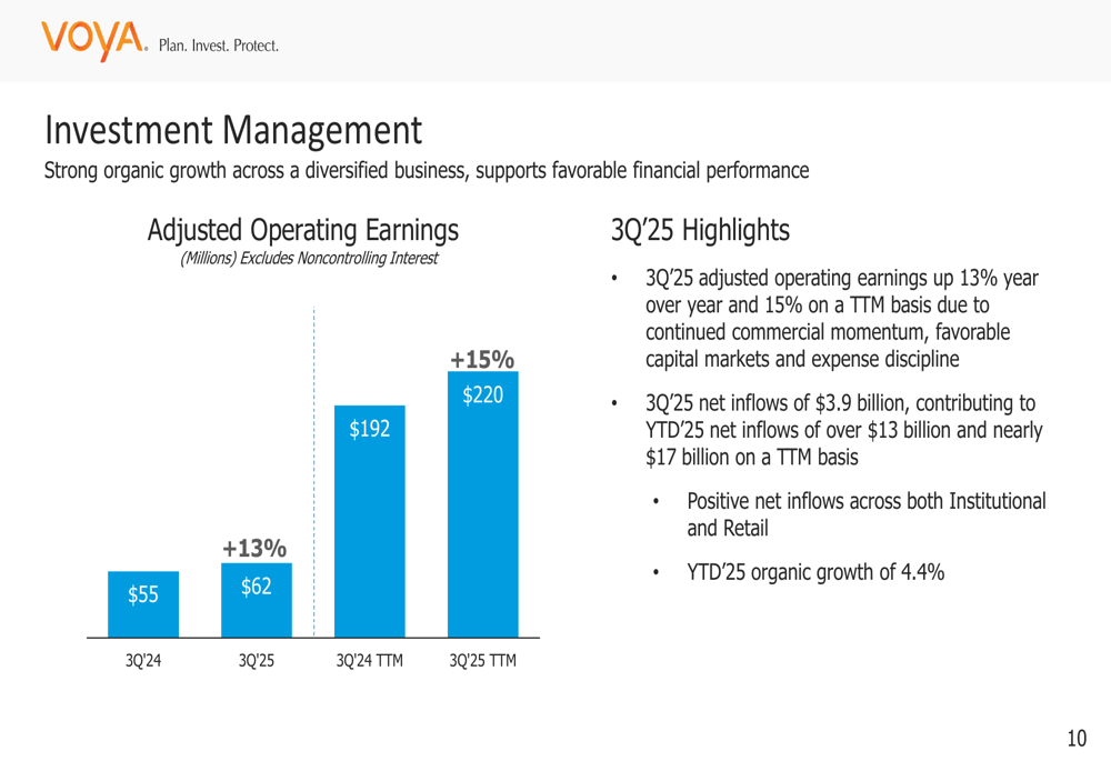Voya's Investment Management segment, representing about 17% of adjusted operating earnings, delivered a 13% year-over-year increase in adjusted operating earnings to $62 million. This growth was attributed to continued commercial momentum, favorable capital markets, and disciplined expense management.