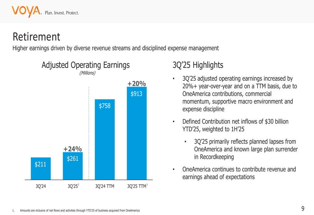 The Retirement segment, which contributes approximately 66% of Voya's adjusted operating earnings, showed impressive growth with a 20% year-over-year increase in adjusted operating earnings to $261 million. This growth was driven by contributions from the OneAmerica acquisition, commercial momentum, and a supportive macro environment.